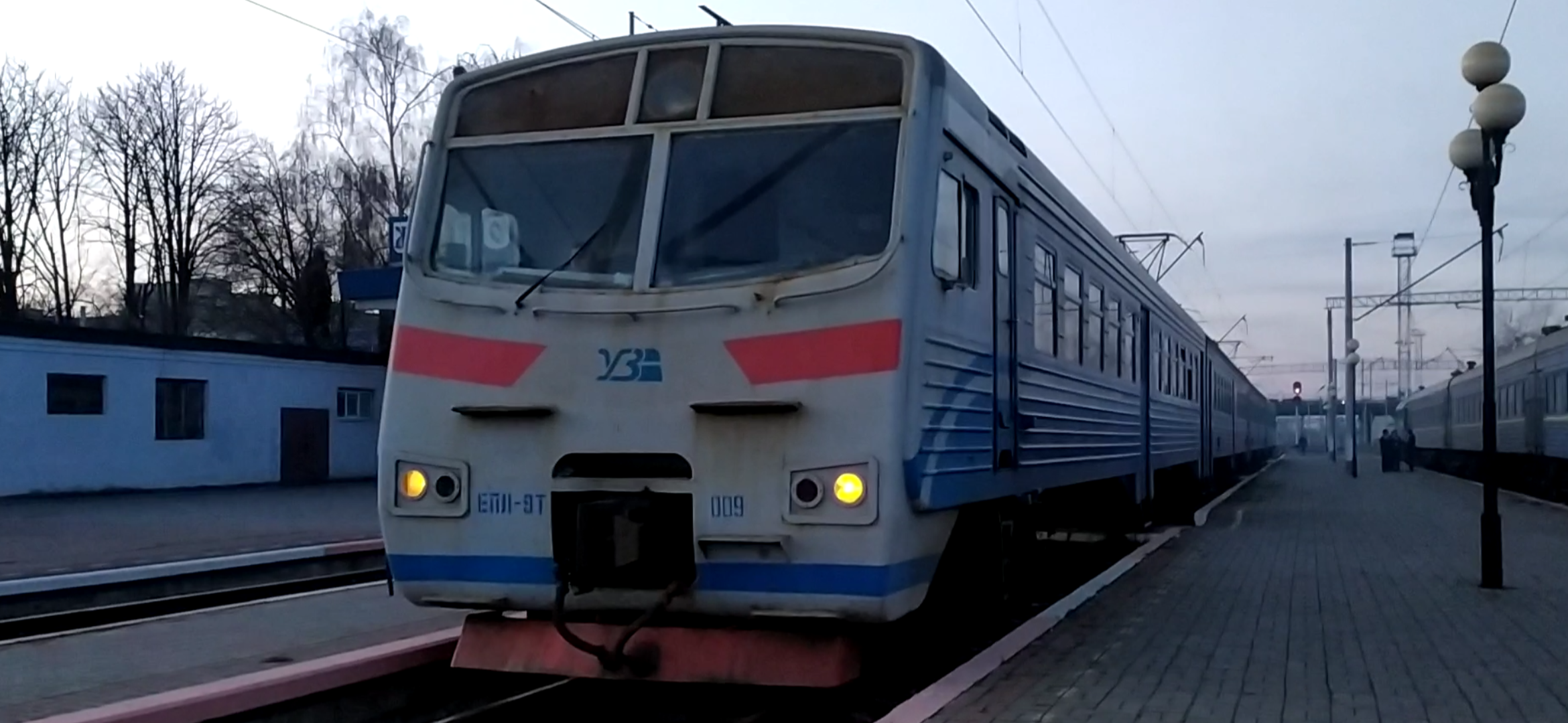Электропоезд ЭПЛ9Т-009 с пригородным поездом Житомир-Фастов отправляется со станции Житомир. Юго-западная железная дорога "УЗ".