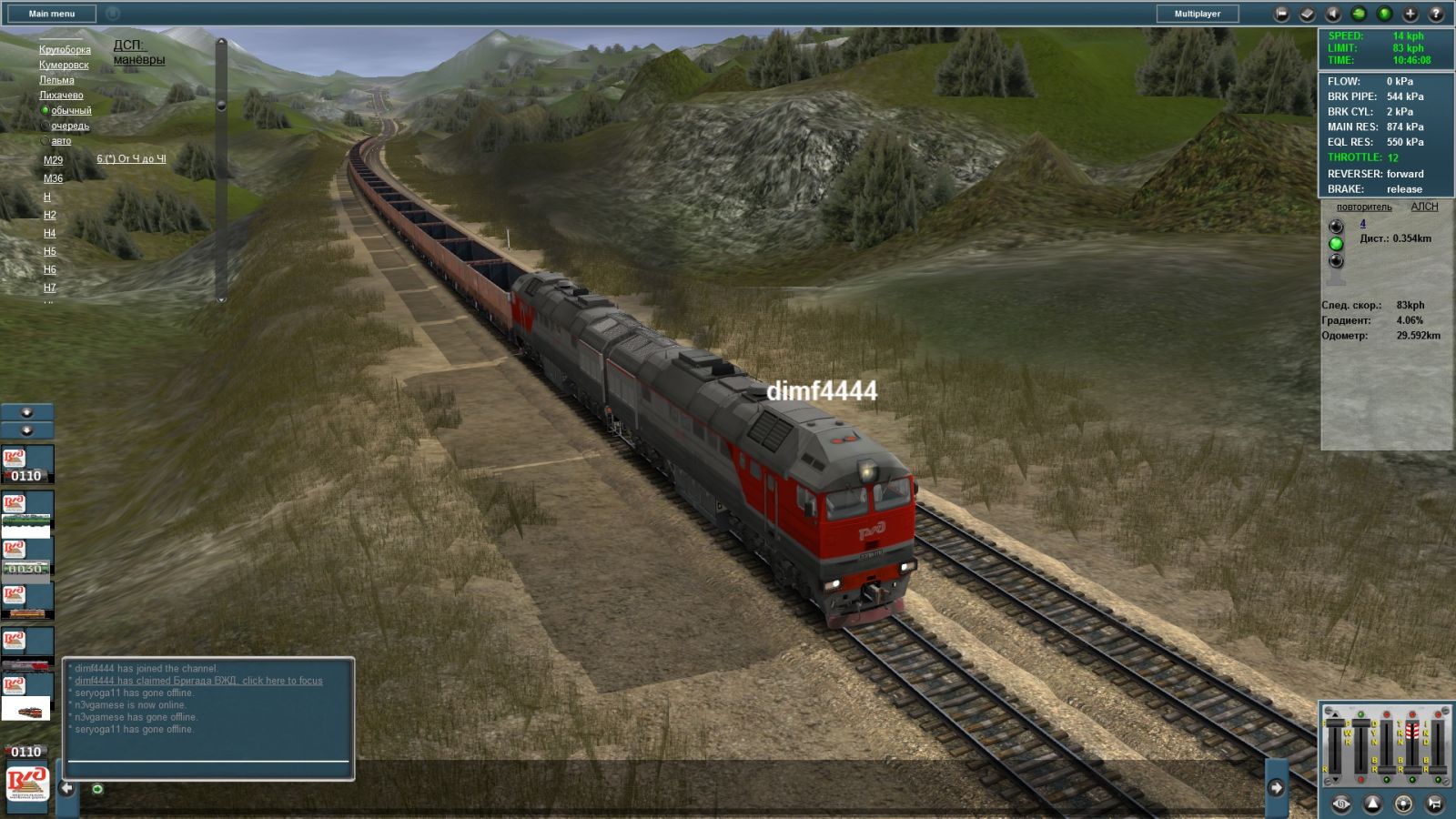 Один из самых первых мультиплееров на версии 3.7, 61388. Машинист dimf4444 въезжает на крутой подъем на перегоне Белогорск - Лихачёво.